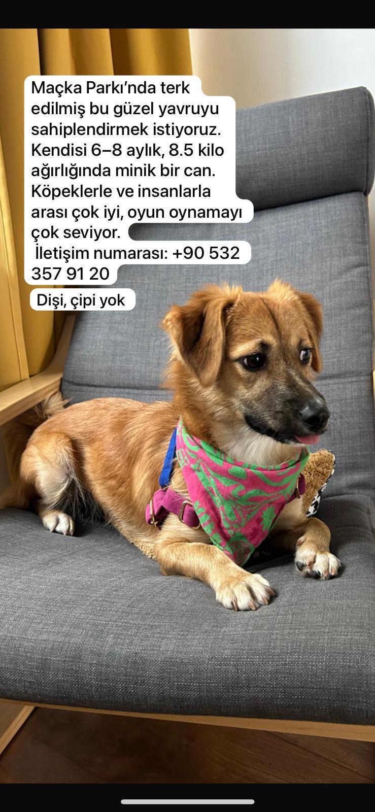 İstanbul Maçka parkında terkedilmiş halde bulundu. 6-8 aylık dişi 8,5 kiloluk küçük-orta ırk dünya tatlısı bir bebek. köpeklerle be kedilerle iyi anlaşıyor ve çok oyuncu, yuvası olmak isterseniz iletişime geçebilirsiniz