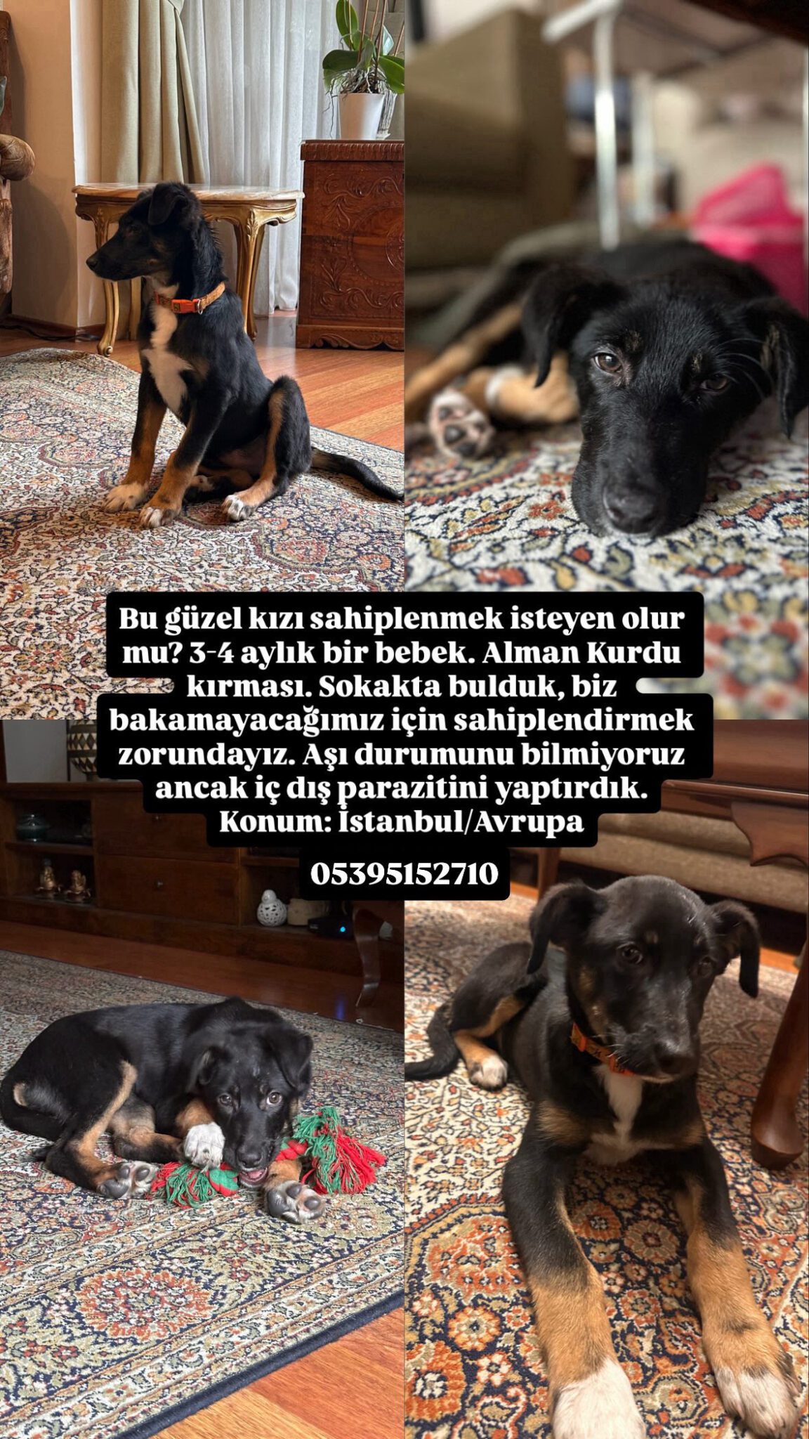 Bu miniği İstanbul/Ataköy’de bulduk, sokağa bırakmışlar. Alman Kurdu kırması çok güzel bir kız. Çipi yok. Aşı durumunu bilmiyoruz. 3-4 aylık civarında. Biz iç dış parazitini yaptırdık. Bizim bakma imkanımız olmadığı için çok acil sahiplendirmemiz gerekiyor. Lütfen gerçekten ilgilenenler ve bakabilecek olanlar yazsın. Çok iyi huylu bir köpek. Sadece çok küçük olduğu için bazı şeyleri öğrenmesi gerekiyor. Tuvalet eğitimi var diye düşünüyoruz çünkü getirdiğimizden beri eve yapmadı. Biraz kemirme huyu var ama oyuncak vererek kemirmemesini sağlayabiliyorsunuz, muhtemelen dişi kaşınıyor.